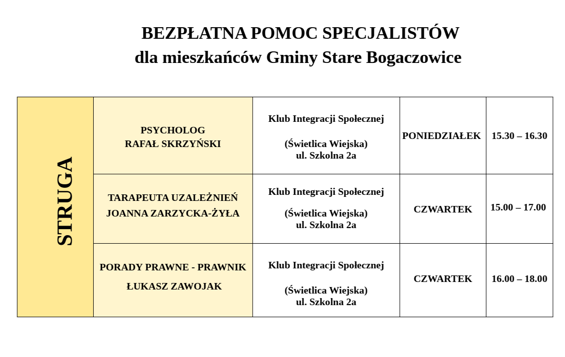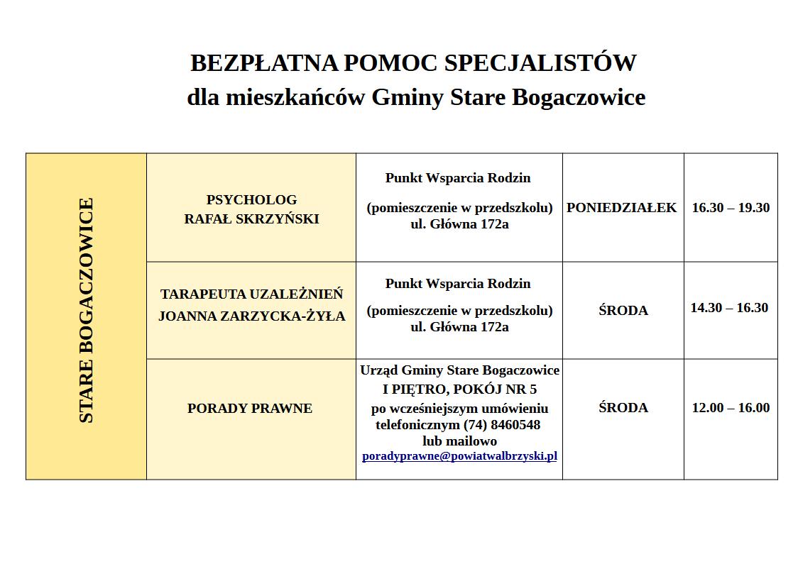 Zachęcamy wszystkich mieszkańców zamieszkujących naszą piękną Gminę do skorzystania z bezpłatnej pomocy specjalistów, którzy  pomogą osobom zainteresowanym w rozwiązaniu rodzinnych i osobistych problemów, udzielą wsparcia i rozwieją wątpliwości. Nasi specjaliści oczekują na wszystkich zainteresowanych w Punkcie Pomocy Rodzinie, który jest zlokalizowany  w dwóch sołectwach: w Starych Bogaczowicach w pomieszczeniach Przedszkola pod Trójgarbem – budynek Szkoły Podstawowej ul. Główna 172 (pod halą sportową) oraz w Strudze w Klubie Integracji Społecznej przy ulicy Szkolnej 2a.